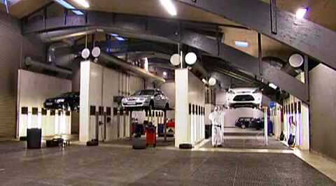 Bilen hissas upp och hjulen samt ett 10-tal plastpaneler på underrede och hjulhus monteras av.